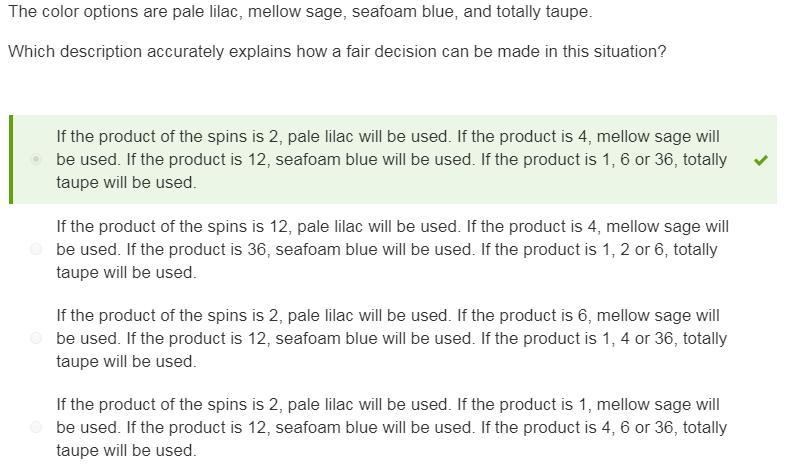 A) If the product of the spins is 2, pale lilac will be used. If the product is 4, mellow sage will be used. If the product is 12, seafoam blue will be used. If the product is 1, 6 or 14, totally taupe will be used.