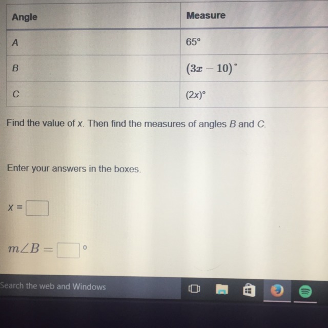 180° = ∠A + ∠B + ∠C 180° = 65° + (3X-10)° + 2X° Drop the parentheses 180° = 65 + 3x - 10 + 2x Combine like terms 180° = 55 + 5x subtract 55 from both sides 125° = 5x divide both sides by 5 25° = x substitute this value for x into the ∠'s