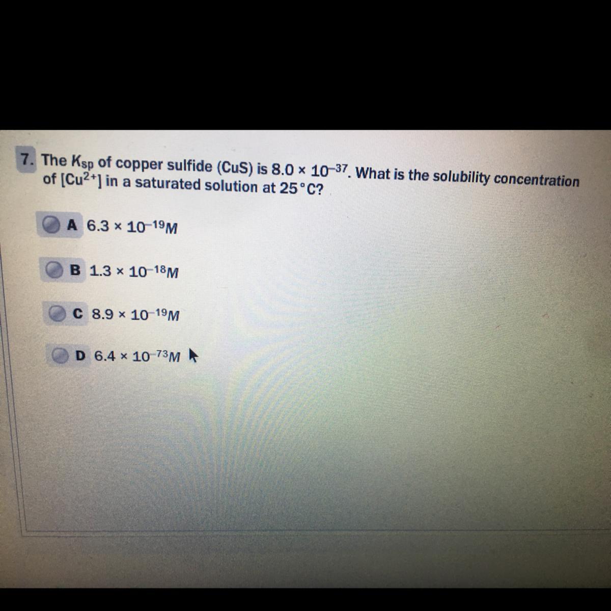 X= √8x10-37 and finally X=[Cu+2]=8.9x10-19M (expressed in molar units)