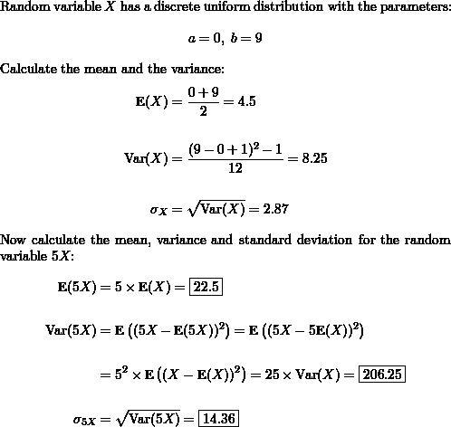 Suppose that X has a discrete uniform distribution on the integers 0 through 9. Determine the mean, variance, and standard deviation of the random variable Y = 5X and compare to the corresponding results for X.