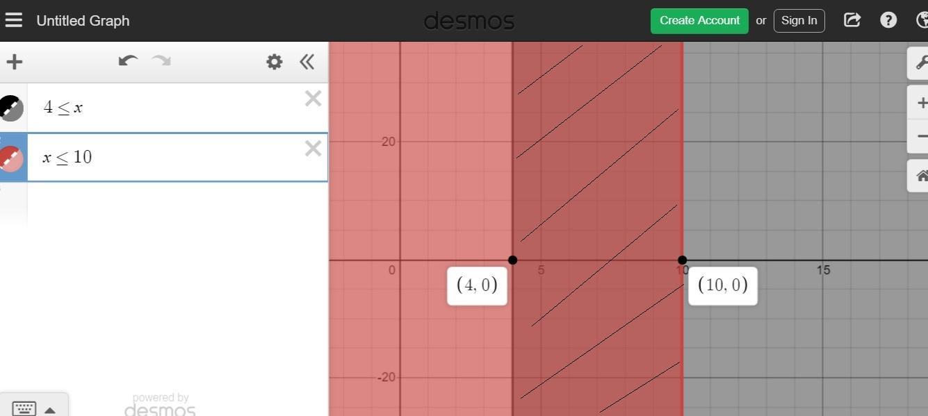 In a number line the solution is the shaded area at right of x=4 (close circle) and at the left of x=10 (close circle)