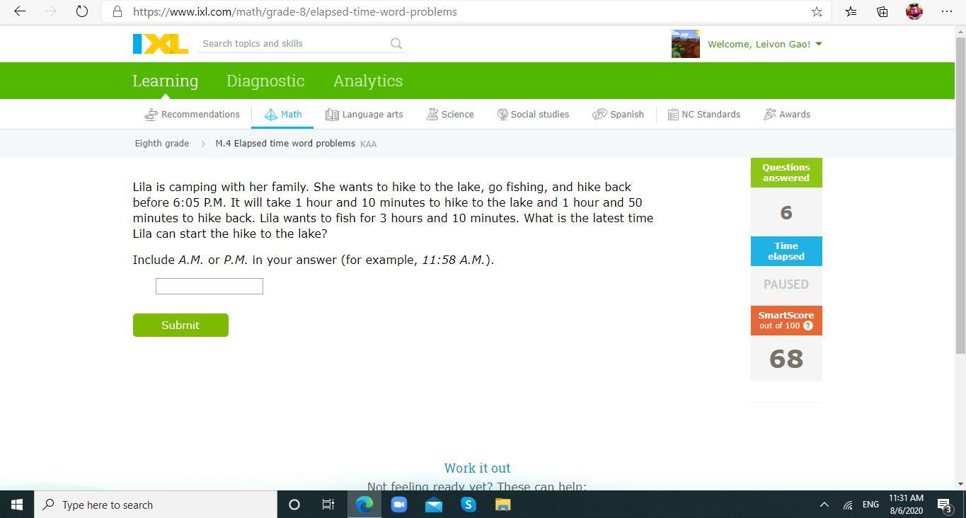To solve this question, the first step is to calculate how much time does hiking to the lake, go fishing, and go back takes in total. This can be calculated by adding the time of the three activities. This means 1 hour 10 minutes + 3 hours 10 minutes + 1 hour 50 minutes which is equal to 6 hours 10 minutes. The detailed process is shown below.