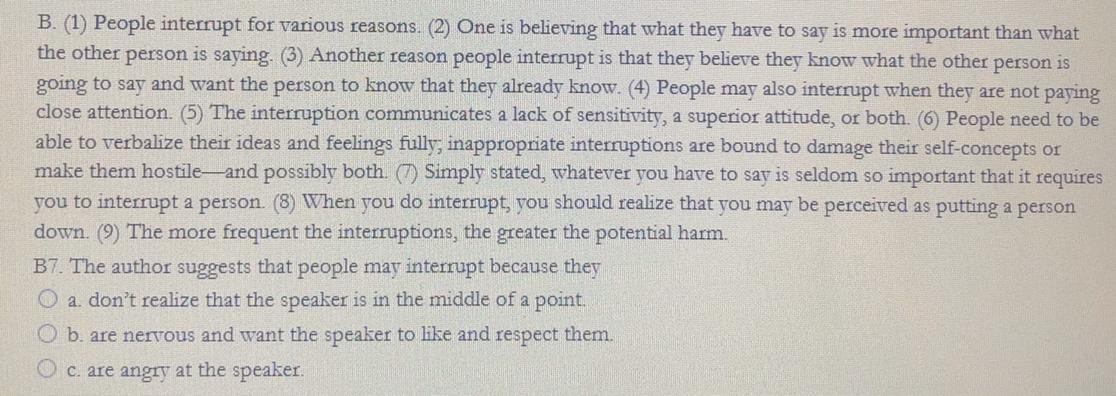 I believe that answer A is more accurate. You can cross out answer C. It can't be answer B because the author is talking about how the speaker would feel if he or she would feel if they were interrupted.