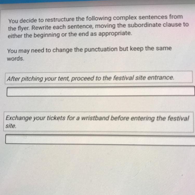 On the other hand, in the second sentence, the independent clause comes first "Exchange your tickets for a wristband" (independent clause) "before entering the festival site " (subordinate clause) because the first clause is complete while in the second there is a subordinate conjunction "before". In this case, you should place the subordinate clause first, and add a comma after it as "Before entering the festival site, exchange your tickets for a wristband".