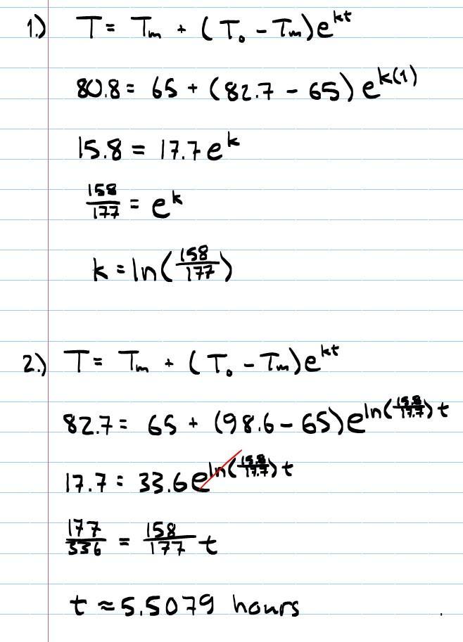 2.) Now we know what <em>k</em> is (how fast the temperature is dropping), we can use it to find how long it took for his fresh body (98.6°) to drop to 82.7° when the police found it.