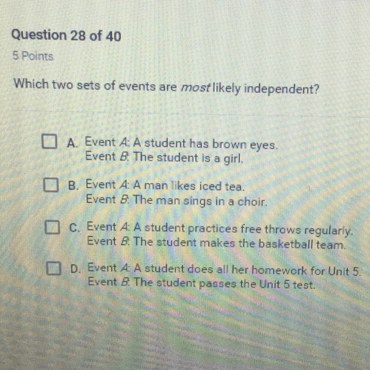 Finally, In D event A is dependent on B. Doing homework can most likely help you pass a test