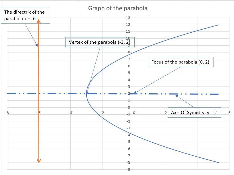 Therefore, the focus of the parabola is \left(-3 + \dfrac{1}{4\cdot \dfrac{1}{12} } , \ 2\right) = (0, 2)