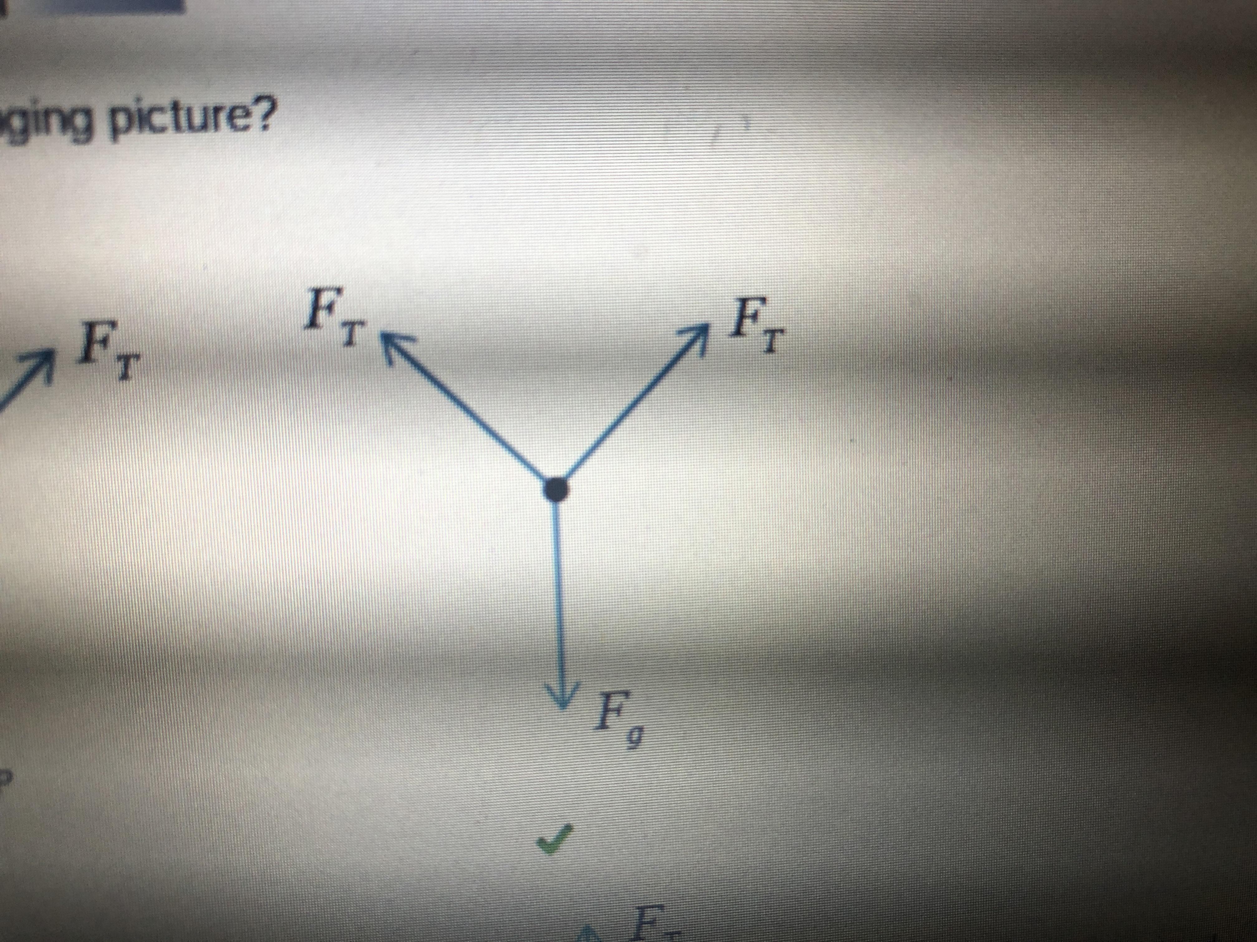A framed picture hangs from two cords attached to the ceiling. Which shows the correct free body diagram of the hanging picture?