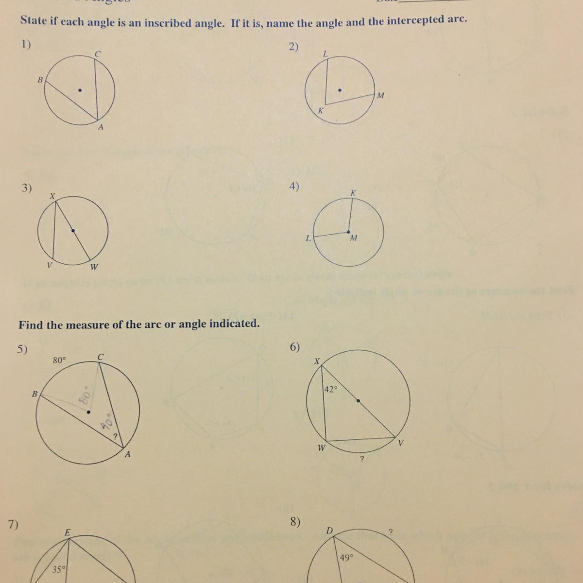 5) Angle CAB is inscribed angle subtended on the arc BC with measure of 80°, so its measure is 40° (half of the measure of arc BC)