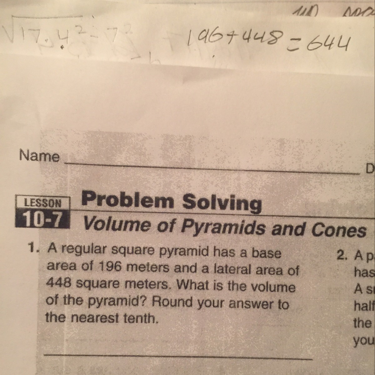 now, check the second picture in it, to get the "slant height" of the pyramid, or the height of the triangle, since we know the "lateral area" or the area of the sides is 448, well, the sides are just 4 triangles, divide that by 4, and you'd get the area of 1 triangle, or 112