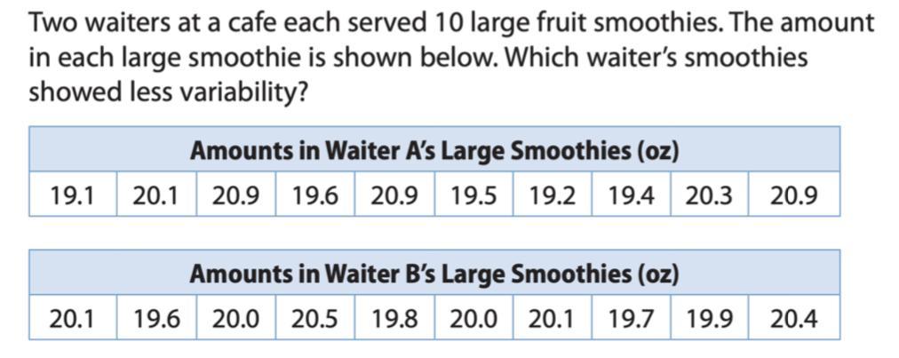 So, Waiter B’s smoothies show less variability.