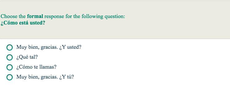 Answer: Muy bien, gracias. ¿ Y usted ?