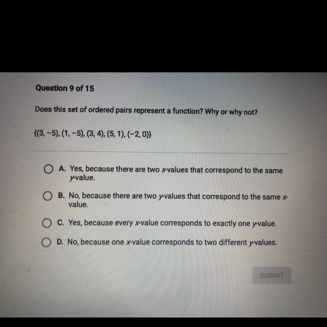 We can see that in our given set each x-value corresponds to exactly one y-value, therefore, the given set represents a function.