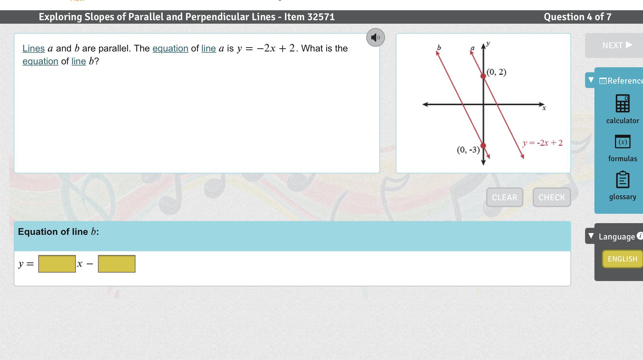 Lines and b are parallel. The equation of line is y=-2x+2. What is the equation of line b?