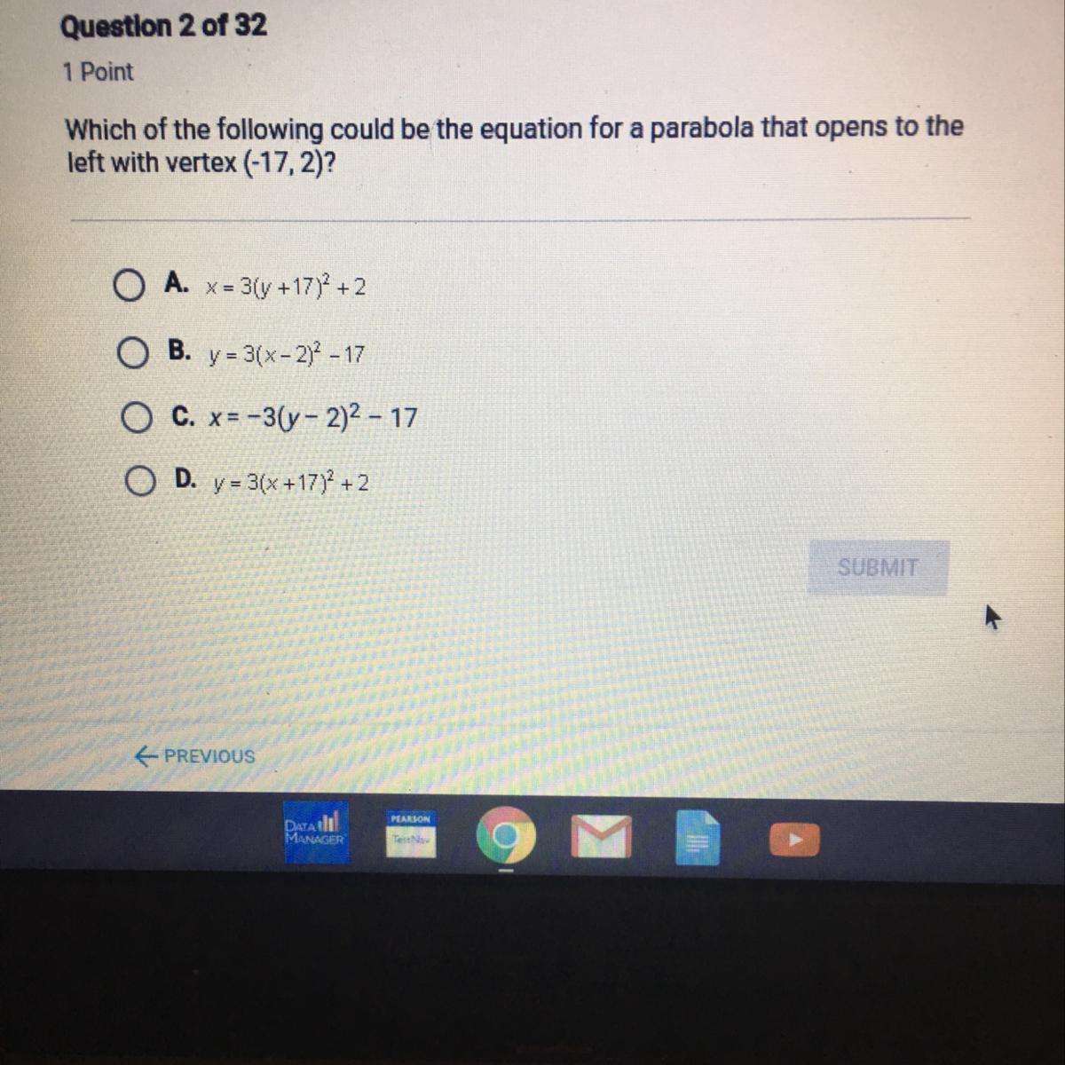 With parabolas, if you're talking in terms of y=x², it will be vertical. If talking in terms of x=y², it will be horizontal. As we're looking for something horizontal (open to the left), we need a x=y² formula. Of C and D, only C is an x=y² formula, and thus the answer.