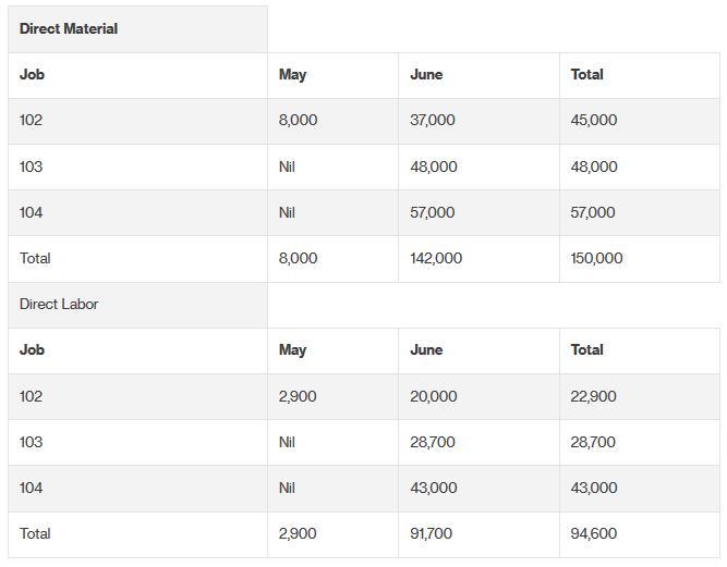 Looking at the question, three jobs are considered. Job 102 was started in May and was completed by June. Other jobs begin in June and will be finished in July. The figures are to be calculated up to June.