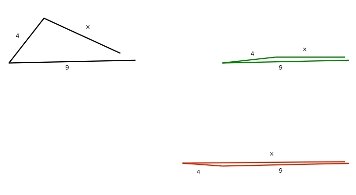on the second case, if we lay the 4 side the other way flat on the ground, "x" will be of length 4 + 9, or 13, however, again, we can't do that, because if we do we'd lose our triangle again, so "x" can't be larger than 13, it has to be smaller than 13.