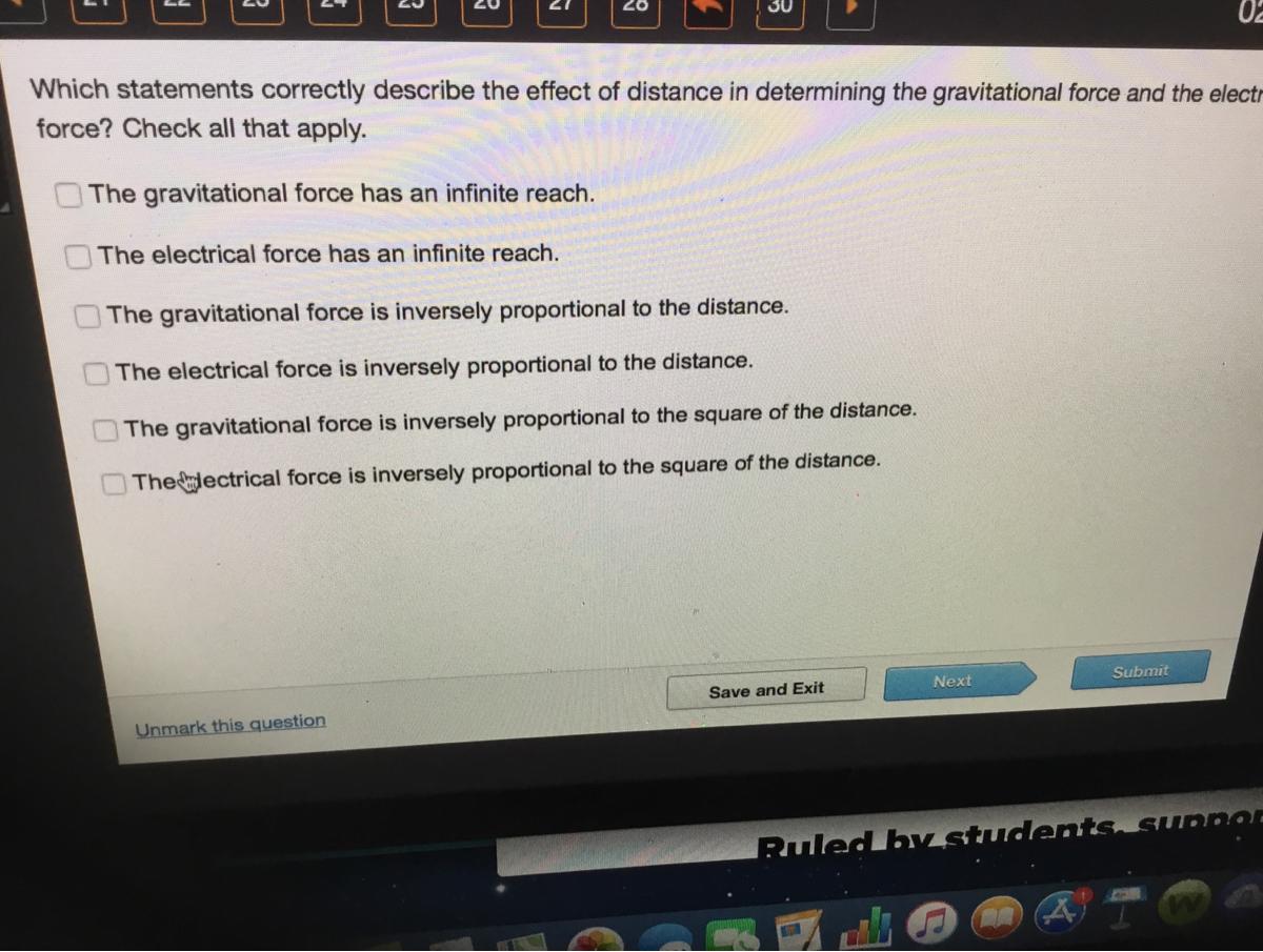 Which statements correctly describe the effect of distance in determining the gravitational force and the electrical force? Chec
