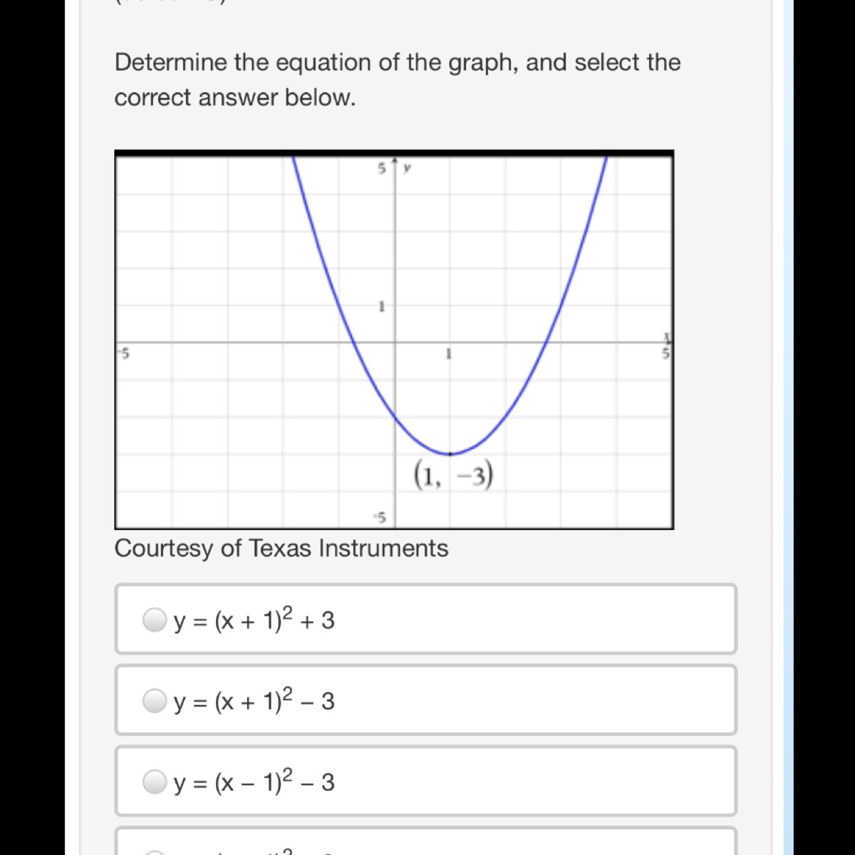 g at the point negative three comma two and going up through the point zero comma twelve and continuing towards infinity Courtesy of Texas Instruments y = (x + 3)2 − 2 y = (x − 3)2 − 2 y = (x + 3)2 + 2 y = (x − 3)2 + 2