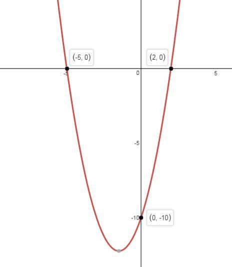 x-intercepts: (2, 0) and (−5, 0) y-intercept: (0, −10)