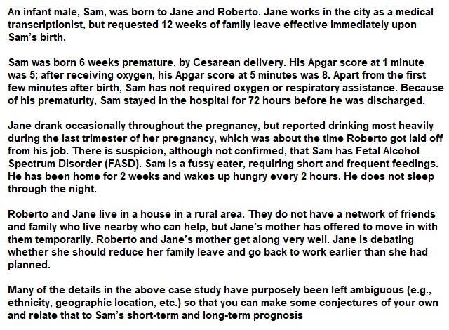 fied in the Case Study that might affect Sam’s development. With the environmental factors you explained, further explain what you think the best case scenario and the worst case scenario might be for Sam’s short-term developmental outcomes and explain why?