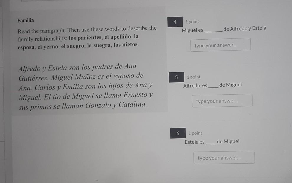 The translation is: Alfredo and Estela are the parents of Ana Gutierrez. Miguel Muñoz is the husband of Ana. Carlos and Emilia are the children of Ana and Miguel. Miguel's uncle's name is Ernesto and his cousins' names are Gonzola and Catalina