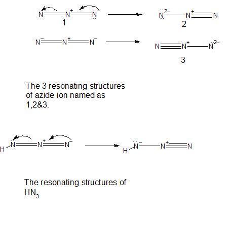 The azide ion basically has 3 resonating forms .There are 3 Nitrogen atoms and the central nitrogen atom is positively charged as it forms double bonds with each of the two nitogens.