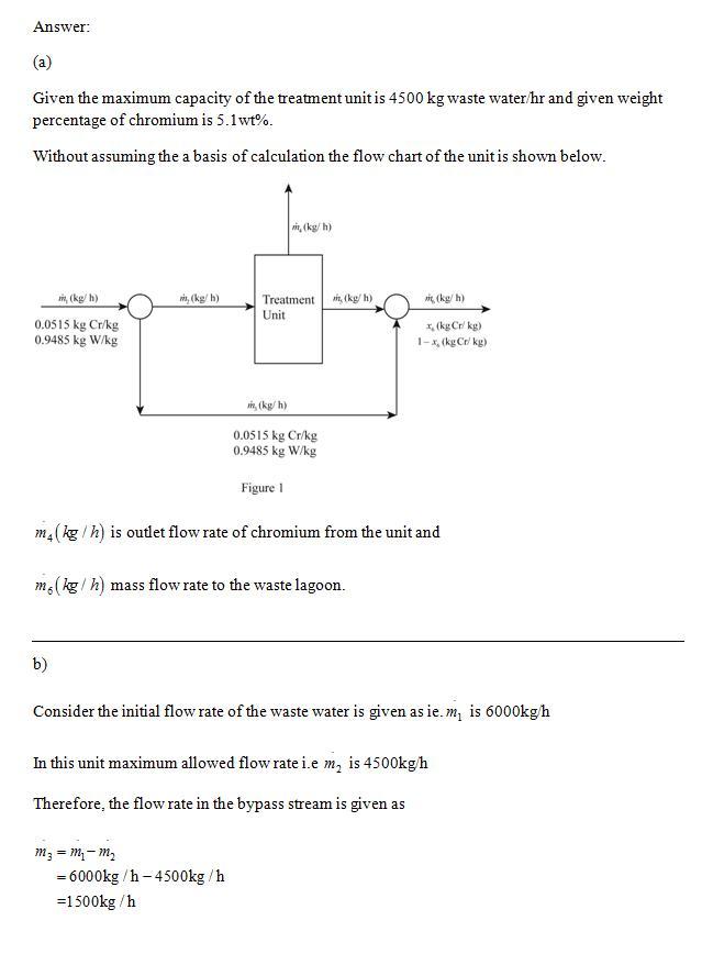 l, lead, manganese, and chromium, in forms that are detrimental to water and air quality. A local metal-finishing plant has identified a wastewater stream that contains 5.15 wt% chromium (Cr) and devised the following approach to lowering risk and recovering the valuable metal. The wastewater stream is fed to a treatment unit that removes 95% of the chromium in the feed and recycles it to the plant. The residual liquid stream leaving the treatment unit is sent to a waste lagoon. The treatment unit has a maximum capacity of 4500 kg wastewater/h. If wastewater leaves the finishing plant at a rate higher than the capacity of the treatment unit, the excess (anything above 4500 kg/h) bypasses the unit and combines with the residual liquid leaving the unit, and the combined stream goes to the waste lagoon.