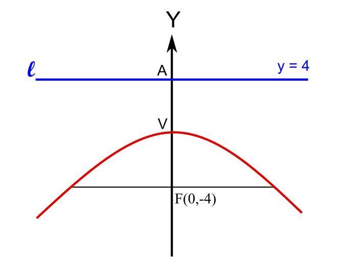 The statement above is represented in the figure below. We have plotted the focus, the directrix and the parabola. So we know that the parabola opens downward. We also know that: