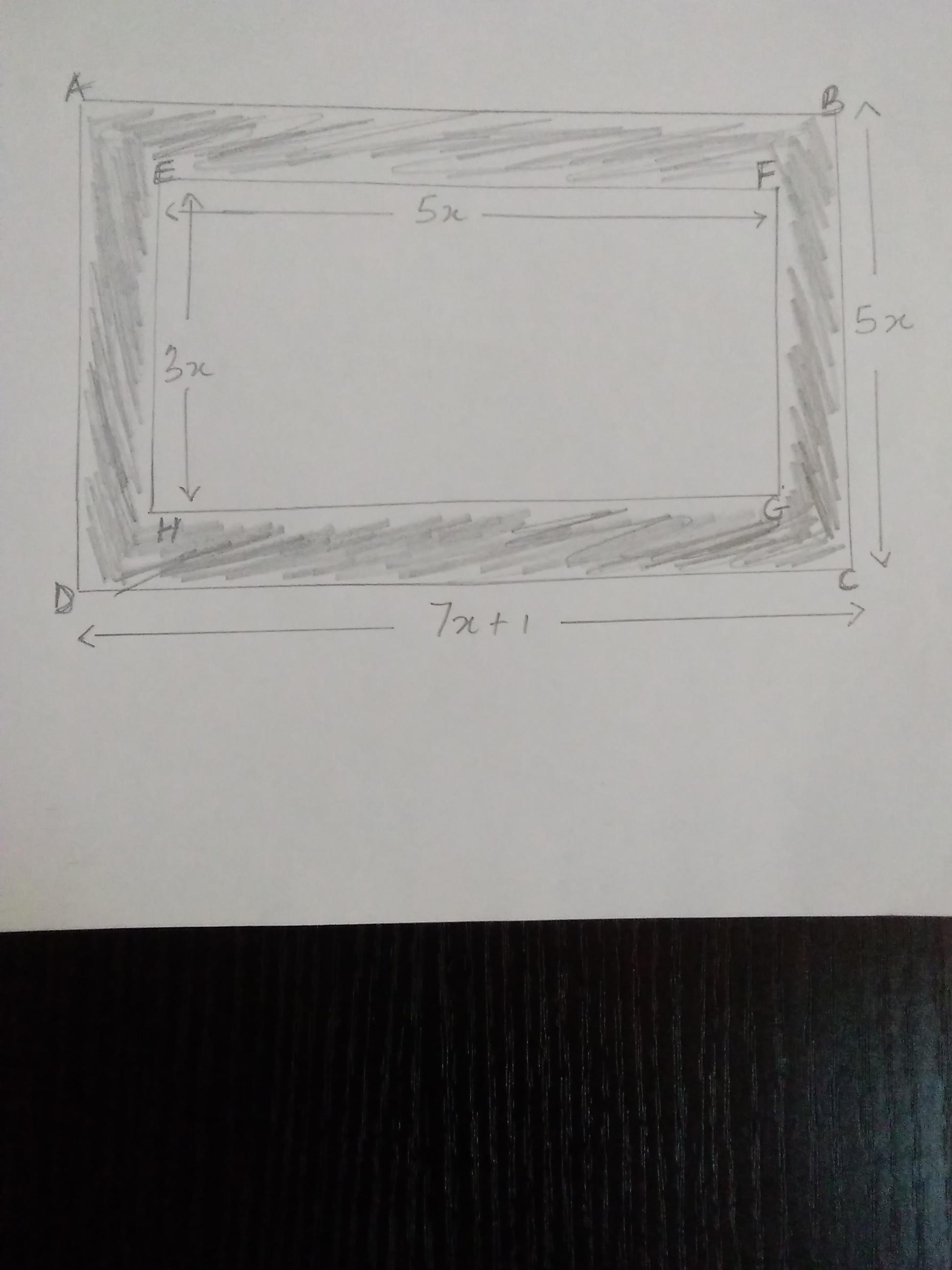 According to the question, the rectangular wooden frame (ABCD) has sides measuring 5x and 7x + 1. Also there is a rectangular opening (EFGH) right inside the wooden frame that measures 3x and 5x.