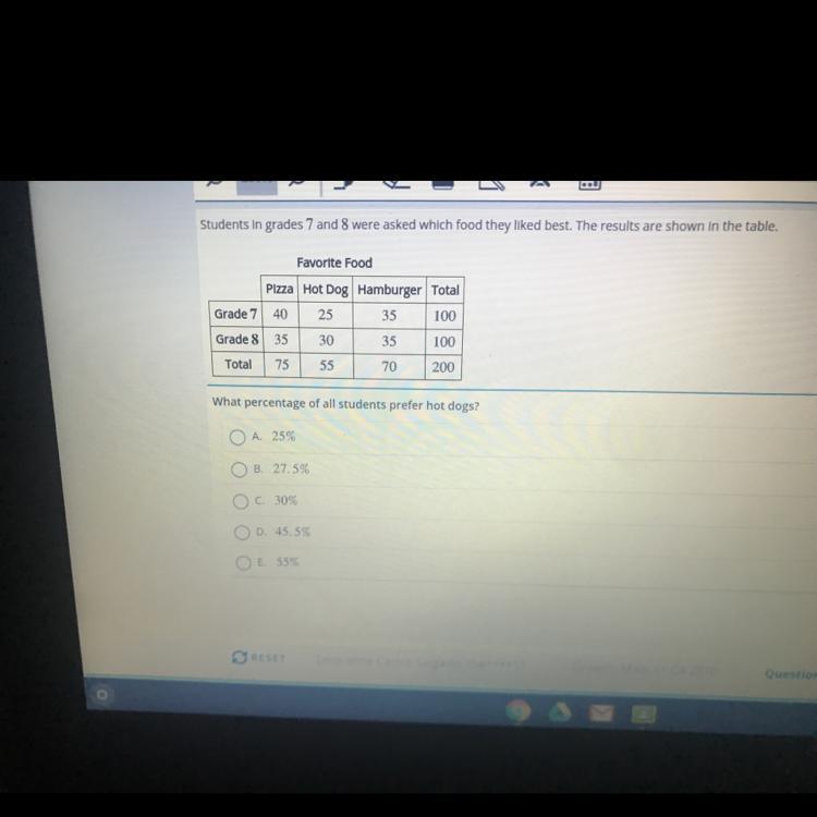 55 kids like hotdogs divided by 200 total kids = 27.5%