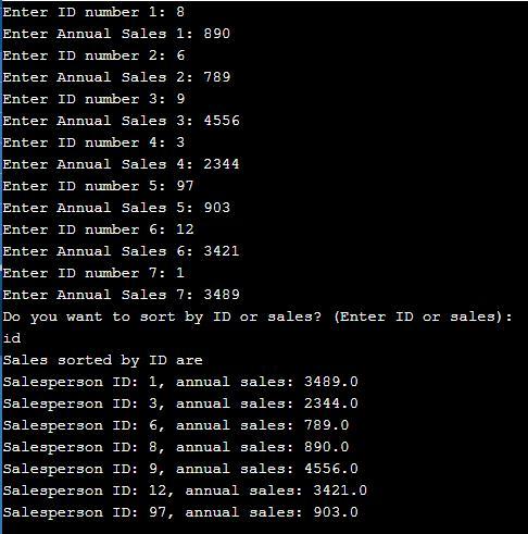 System.out.println("Sales sorted by ID are ");//print message