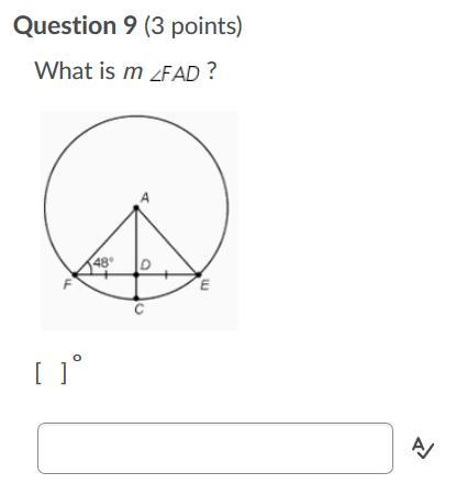 The image shows a circle with two similar triangles FAD and EAD. We know they are congruent because they share the same height and have a base of the same value (as indicated by the ticks). The segment AD must be perpendicular to FE since it comes from the center of the circle. We can conclude is right, i.e. measures 90°.