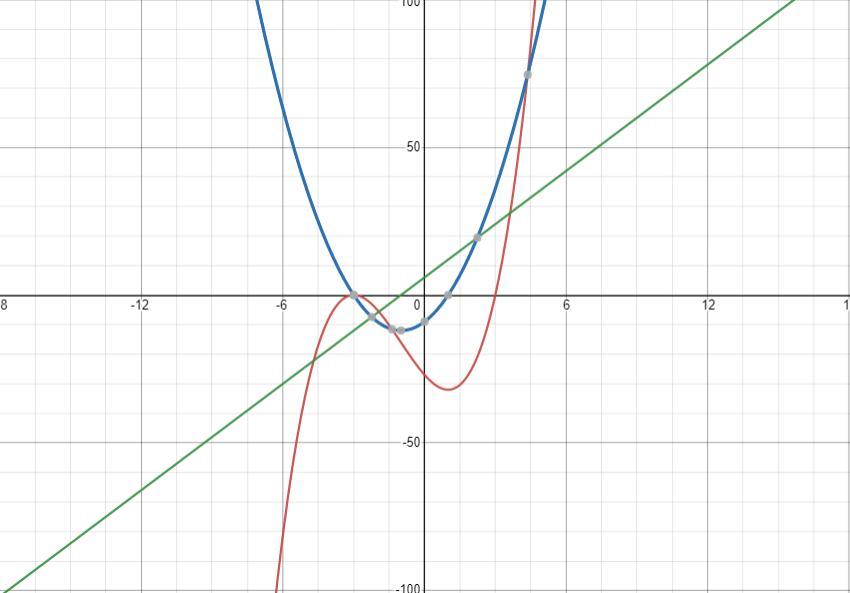 I graphed this to obtain a clear relation between the equation and its derivatives, <u><em>the second graphed equation is in blue color</em></u> and it's the first derivative: