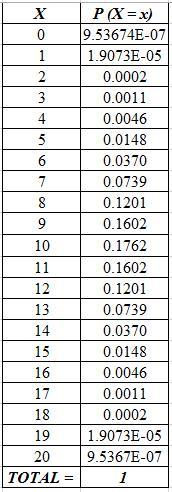 P (X ≥ 15) = P (X = 15) + P (X = 16) +... +P (X = 20) = 0.0207