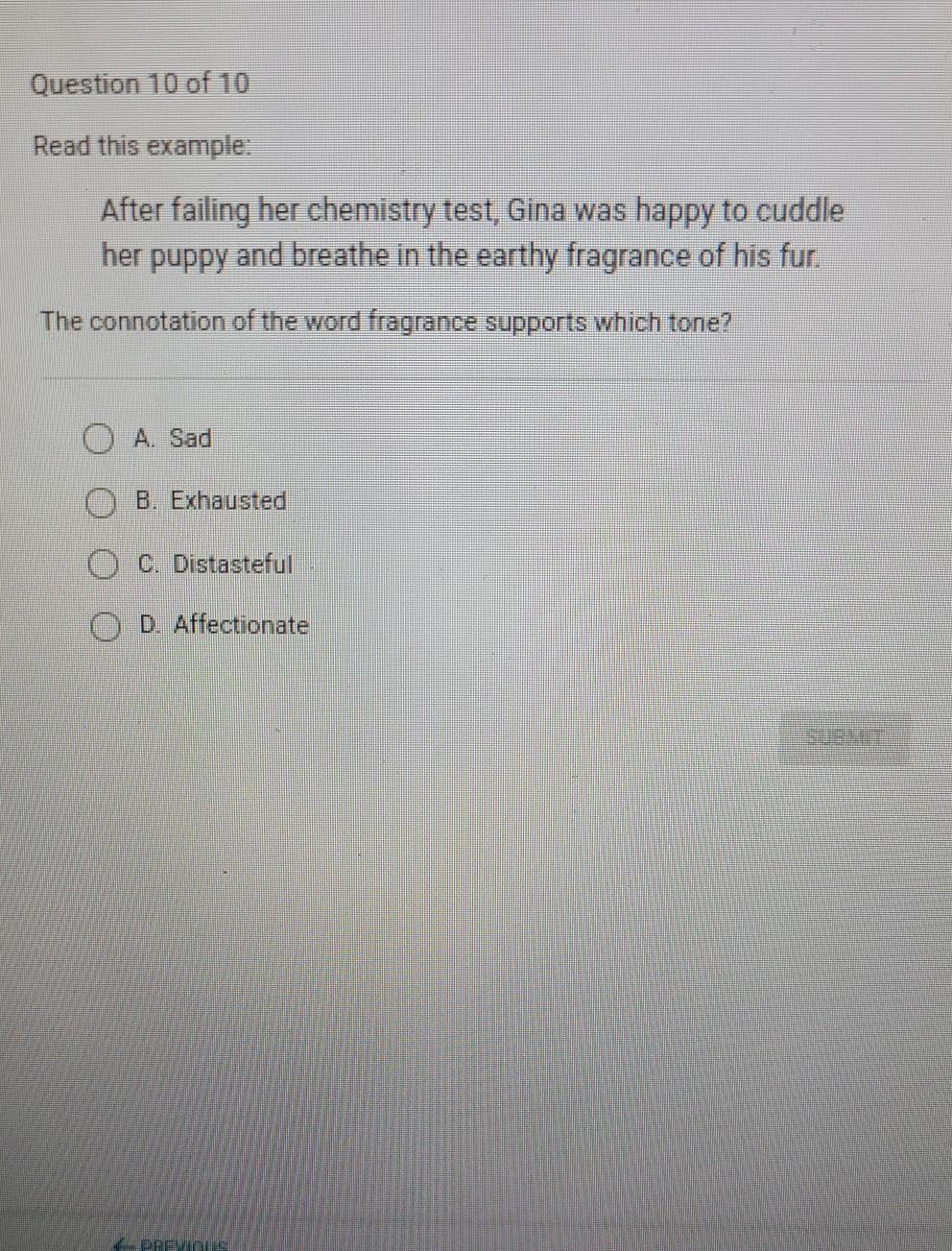 Explanation: because after failing her chemistry test, she was happy to cuddle with her puppy and breathe in the earthy fragrance of his fur