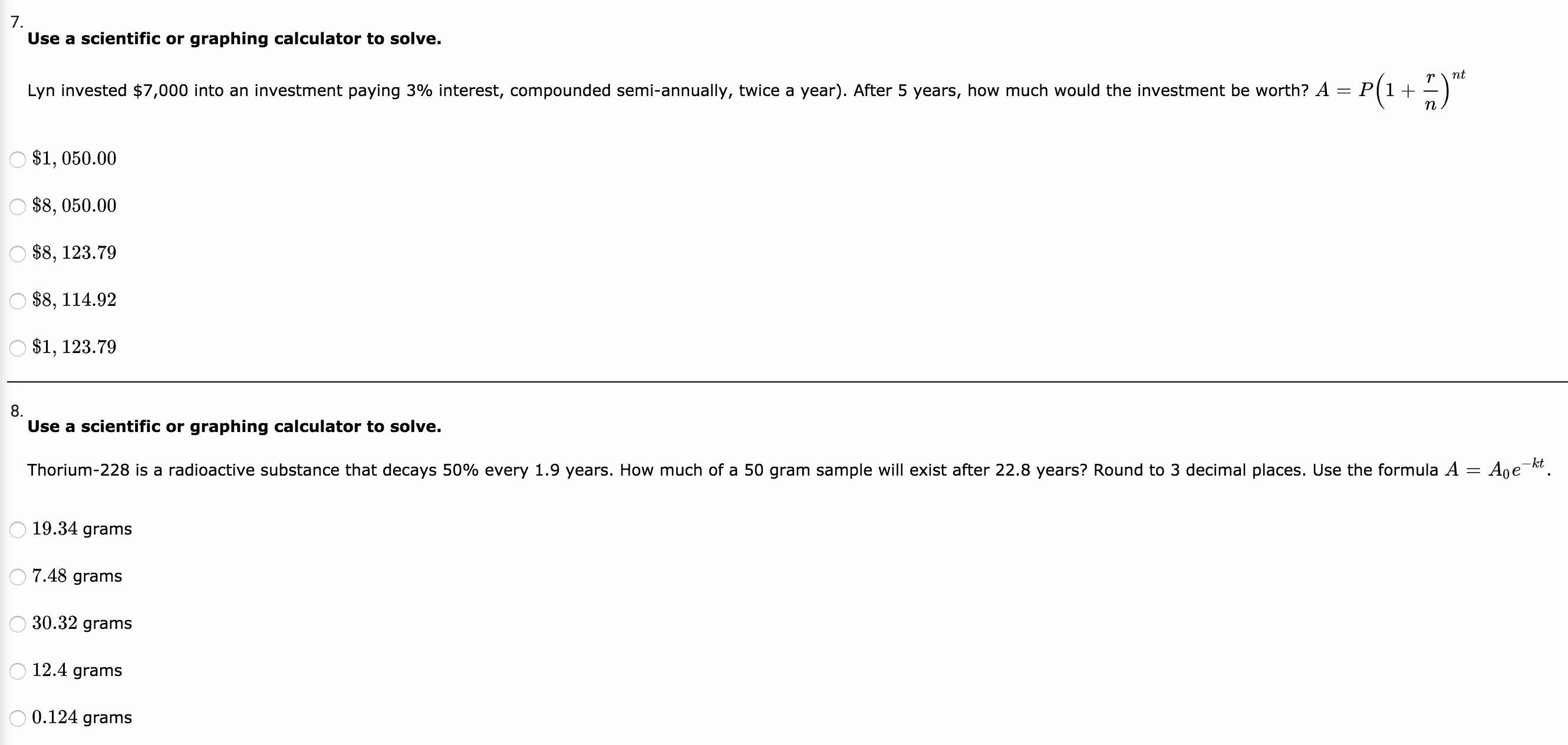 You will notice that the answer to problem 8 does not agree with any of the offered choices. The time period of 22.8 years is 12 times the half-life of the substance, so there will be (1/2)^12 = 1/4096 of the original amount remaining. The time periods corresponding to the amounts shown range from 1.37 years to 16.4 years.