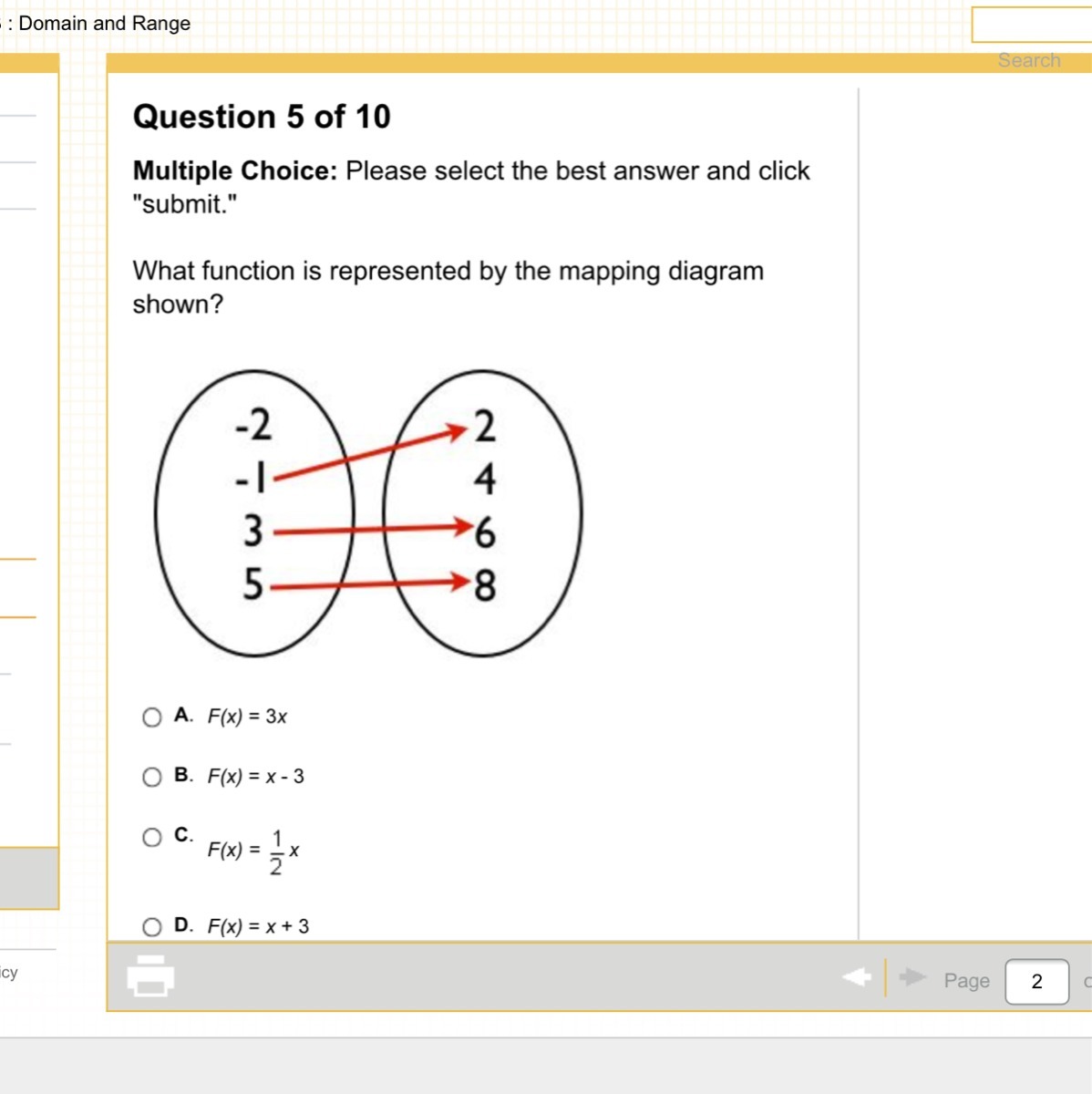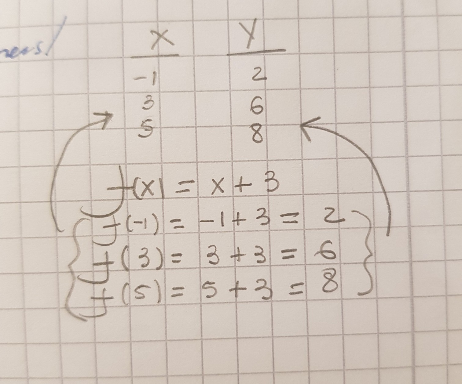 But to be accurate, this isn't even a function. For it to be a function, that -2 couldn't be without a pair. There should be a 1 on the right side. So, when you do f(x) = -2 + 3 you get 1. This set of numbers (-2, -1, 3 and 5) is called domain, and all elements of the function's domain has to have a pair in the codomain(2, 6, 8, 4). That doesn't happen, as we don't see a 1 there, that could be assigned to the - 2 of the domain.