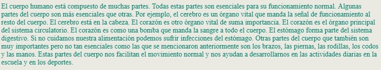 The human body is composed of many parts. All these parts are essential for normal operation. Some parts of the body are more essential than others. For example, the brain is a vital organ that sends the signal of functioning to the rest of the body. The brain is in the head. The heart is another vital organ of the utmost importance. The heart is the main organ of the circulatory system. The heart is like a pump that sends blood to the whole body. The stomach is part of the digestive system. If we do not take care of our food we can suffer infections of the stomach. Other parts of the body that are also very important but not as essential as those mentioned above are the arms, legs, knees, elbows and hands. These parts of the body facilitate movement and help us develop in daily activities at school and in sports.
