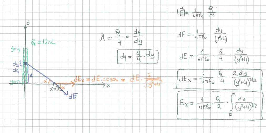 Now we will integrate this quantity over the whole distribution to obtain the x component of the electric field at x = 2m on the x axis: