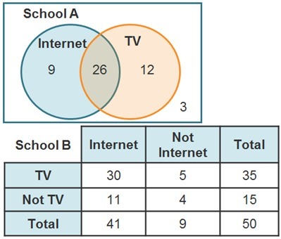 Students from School A and School B were asked whether they watch TV or use the Internet after finishing their homework. The Ven