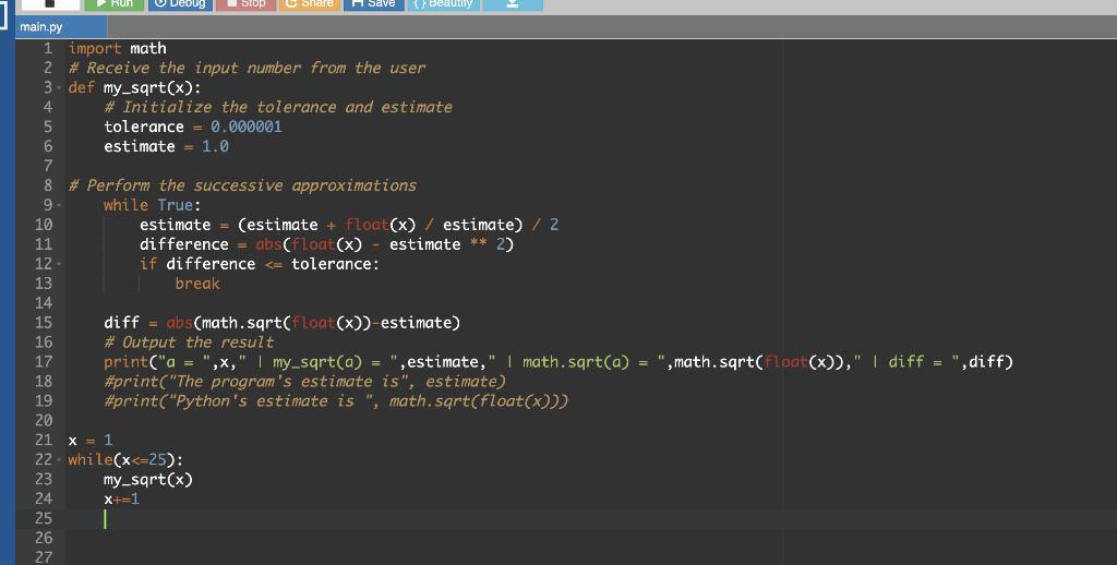 print("a = ",x," | my_sqrt(a) = ",estimate," | math.sqrt(a) = ",math.sqrt(float(x))," | diff = ",diff)