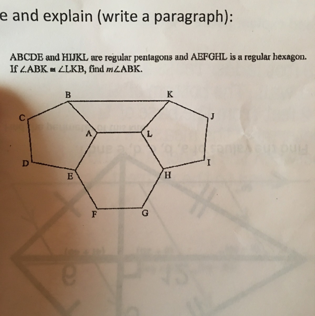 The angles of a quadrilateral sum to 360 degrees. A pentagon's exterior angles are 108 degrees. A hexagon's exterior angles are 60 degrees. So, <BAL AND <KLA are 60+108 or 168. 168 + 168 = 336. 360-336 = 24. If you write m<ABK as x, you can write the sum of <ABK and <LKB as 2x. If 2x=24, x=12. So, m<ABK is 12 degrees.