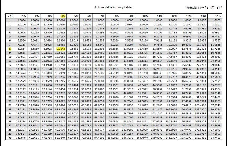 Future Value of Annuity = Annuity * Future value annuity factor, 8 years, 8%