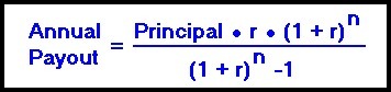 Annual Payout = Principal * rate * (1 +r)^n / [(1 + rate)^n -1]