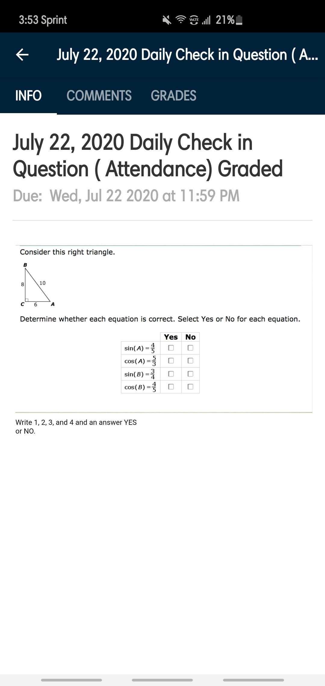 Consider the right triangle. Determine whether each equation is correct. Select yes or no for each question.