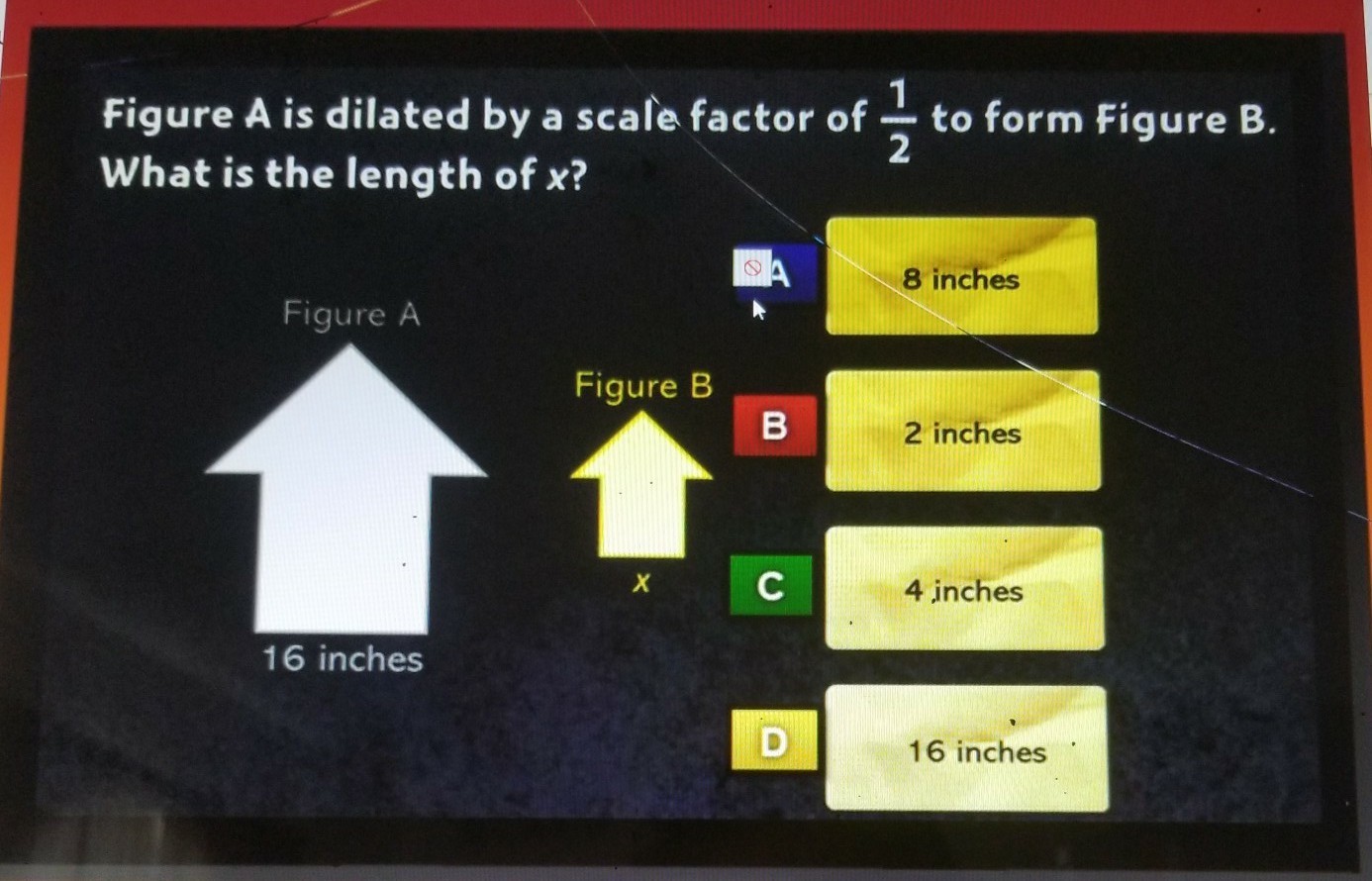 Therefore, your answer is <u>A, x = 8 inches</u>.