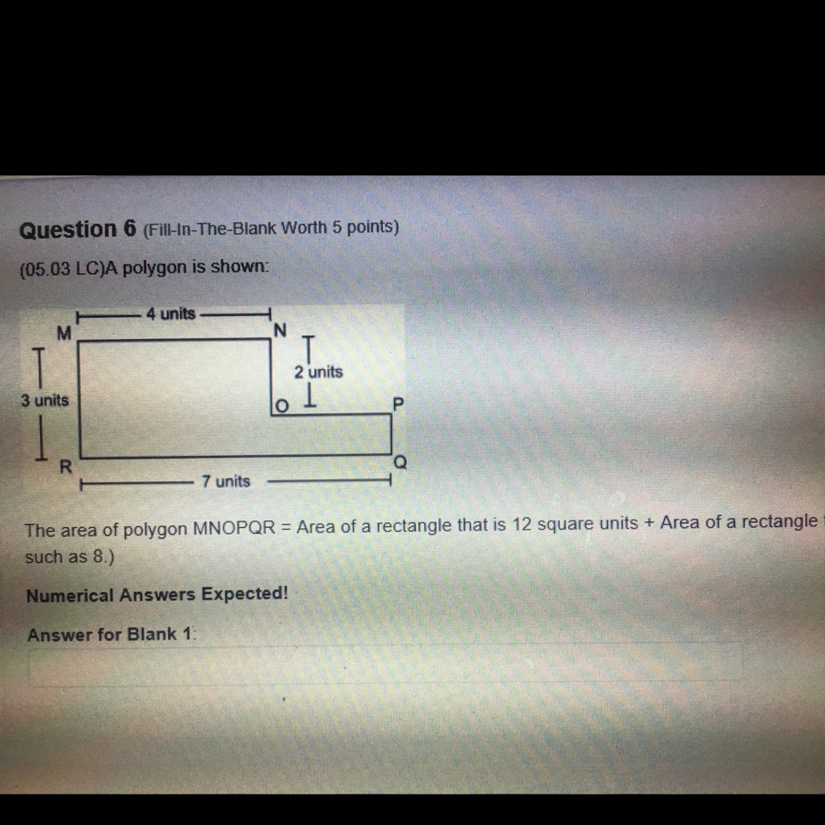 Hence, the area of polygon MNOPQR = Area of rectangle MNSR that is 12 square units + Area of rectangle OPQS that is 3 square units.