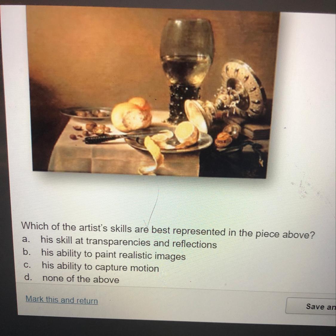 The answer is a,b and c as the artist has created great transparency and reflections to the point the whole image becomes realistic and then his ability to capture motion as you can see things have fallen over and he has captured every little detail.