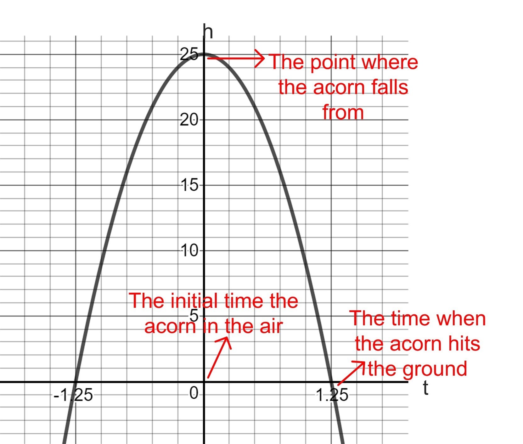 and when the distance is zero i.e, at the ground the time is 1.25 seconds